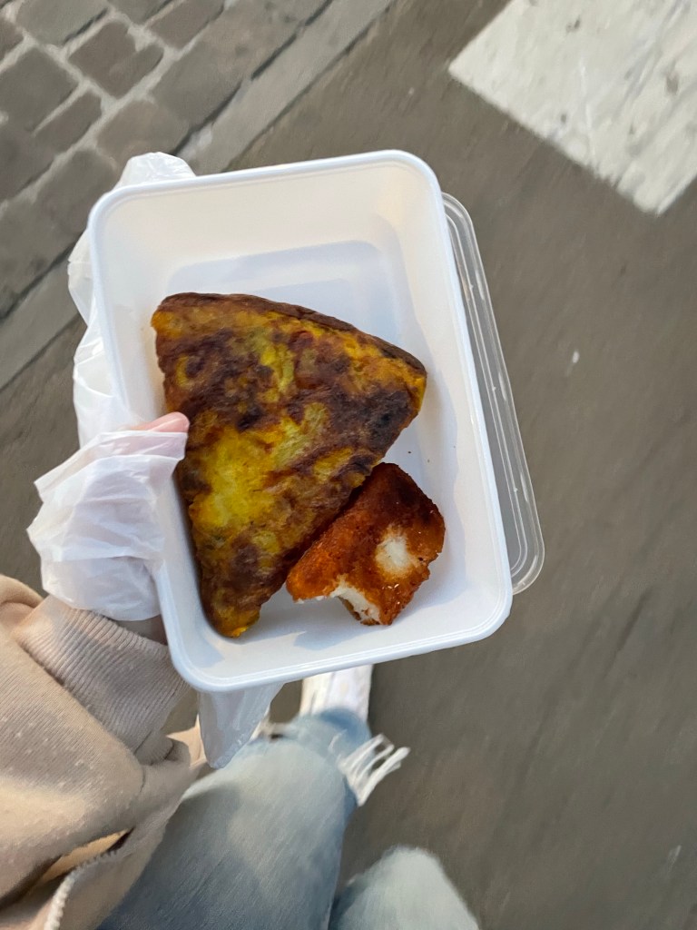 I got the closest food I could find, suddenly no longer picky. I got some potato thing and some fried cheese and ate it quickly as I speed walked home, constantly checking behind me.