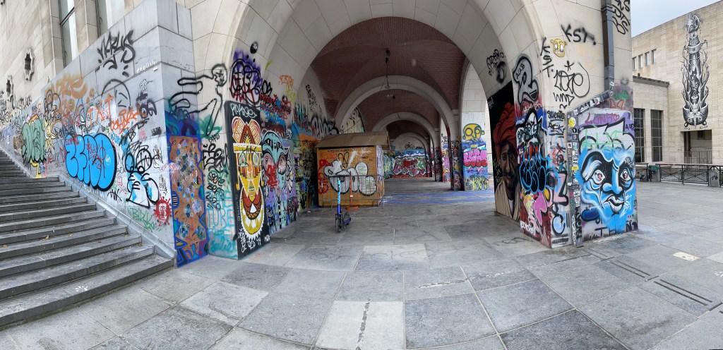 Waking up in yet another empty hostel dorm, I filled up on the free hostel breakfast and set off. It looked to be overcast and rainy all day, so the morning was, for lack of a better word, glum. I got some coffee and sat outside to read, hoping that the energy of the city would soon pick up. I then started deeper into the city and saw some beautiful street art and graffiti. Ive been doing my best to limit my spending but I could not resist when I saw a sign for Pylones- a European store Ive always loved. I walked a lot all day, going from store to store and just following the busiest streets, so I was relieved to find the Muse de Arts- a beautiful garden. I was in the capital of Brussels, surrounded by many elegant capital buildings and beautiful gardens. I went from one garden to the next, resting and reading until I was ready to continue onward. I really wanted to see an art museum, but they were all closed on Monday so I headed to the next best thing- the chocolate museum!