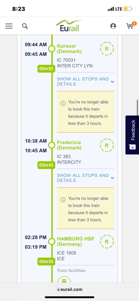 My night train to Malmö was from 11pm to 5am. I slept on and off but never fell into a deep sleep. I then got off and boarded a 30 min train to Copenhagen. Once in Copenhagen, things got complicated. I was supposed to board a 6 hour train to Hamburg, then a 3 hour one to Berlin and be done, but the listing for that train was not posted at the station although it showed up on my rail pass app. I talked to a ticket helper and she told me to board a random train, then a bus, and all this stuff I was very flustered. So, confused and very sleep, i