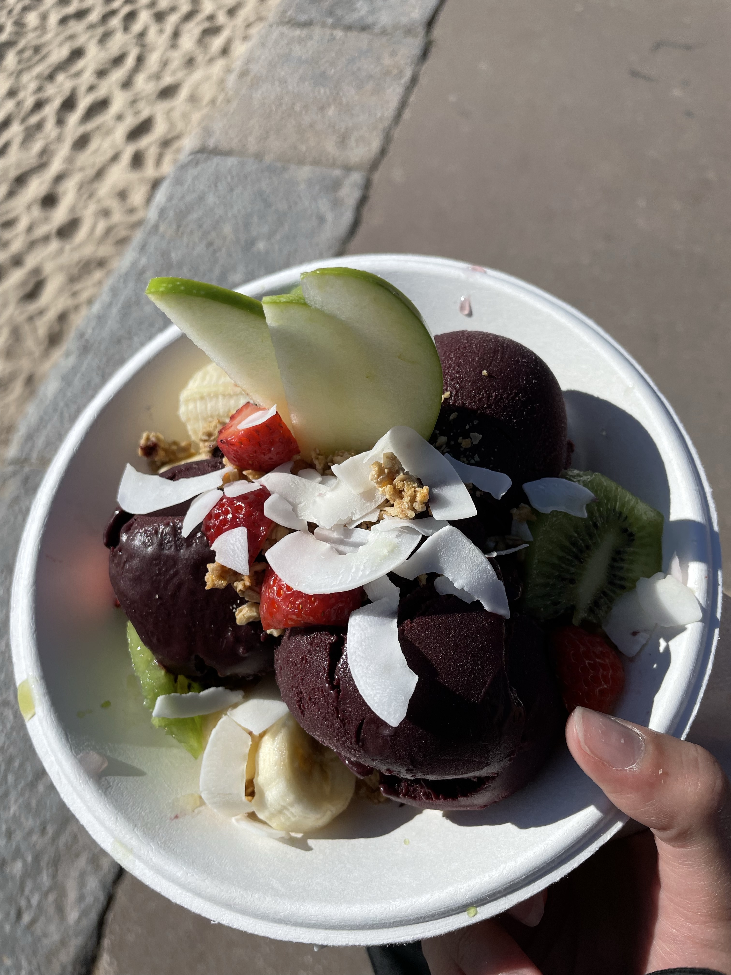 I had a lot of fun!! I fell so much and it was so difficult but I was able to stand a couple times on the board which felt so good! Surfing is definitely something I want to try again. We were both so worn out after the lesson, we sat in a cafe and warmed up with coffee and fries. Then, before leaving we got some amazing açaí bowls.